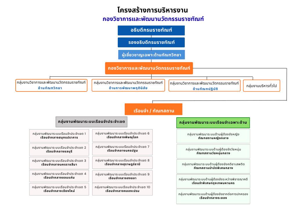 โครงสร้างการบริหารจัดการ โครงสร้างการแบ่งงานและหน้าที่ความรับผิดชอบ กองวิชาการและพัฒนานวัตกรรมราชทัณฑ์เป็นส่วนราชการภายใน(แนบท้ายคำสั่งกรมราชทัณฑ์ ที่ 122/2567 ลงวันที่ 5 กุมภาพันธ์ 2567) คำสั่งกรมราชทัณฑ์ ที่ 122/2567 ลงวันที่ 5 กุมภาพันธ์ 2567 จำนวนผู้เข้าชม 159