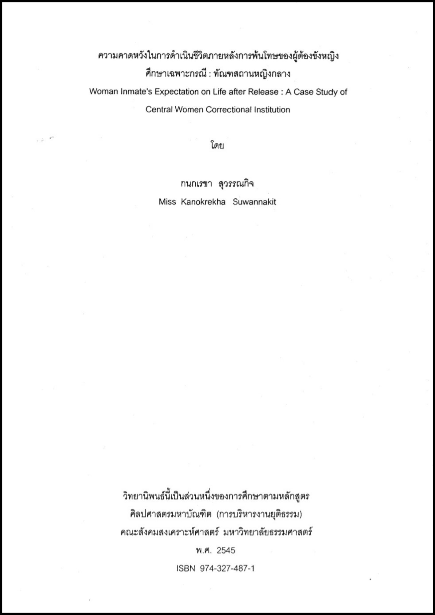 ความคาดหวังในการดำเนินชีวิตภายหลังการพ้นโทษของผู้ต้องขังหญิง ศึกษาเฉพาะกรณี ทัณฑสถานหญิงกลาง