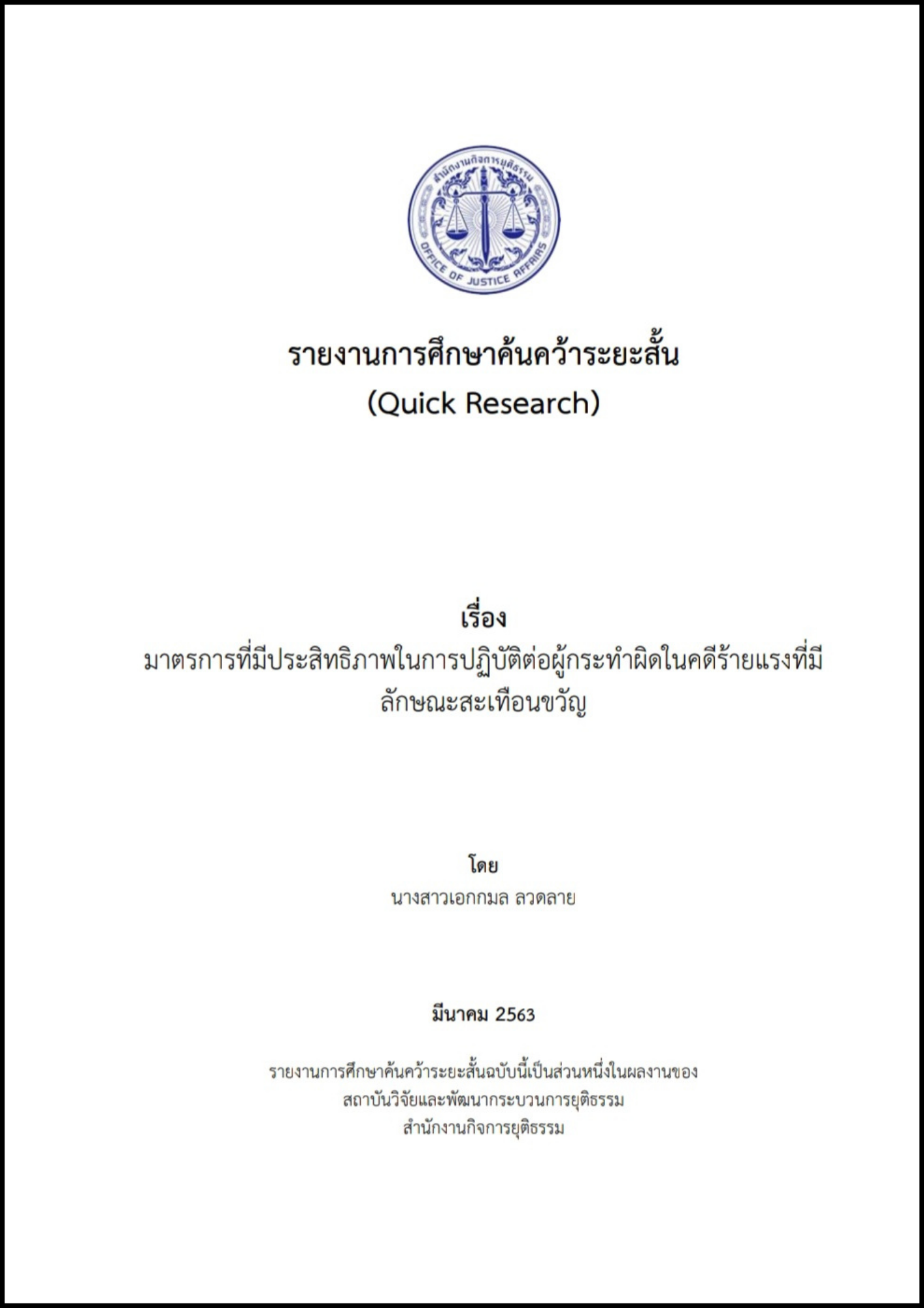 ศึกษาการแบ่งประเภทผู้กระทำผิด ผู้ต้องขังอย่างเหมาะสม และศึกษาแนวทาง หรือมาตรการในการปฏิบัติต่อผู้กระทำผิดในคดีร้ายแรงที่มีลักษณะสะเทือนขวัญ ตั้งแต่เมื่อเข้าสู่กระบวนการยุติธรรม จนกระทั่งถูกปล่อยตัวออกจากสถานคุมขัง เพื่อเป็นแนวทาง ข้อเสนอ ต่อคณะกรรมการในการดำเนินงานให้ประสิทธิ ภาพ สร้างความเชื่อมั่นในกระบวนการยุติธรรมและสร้างสังคมที่สงบสุขปลอดภัย