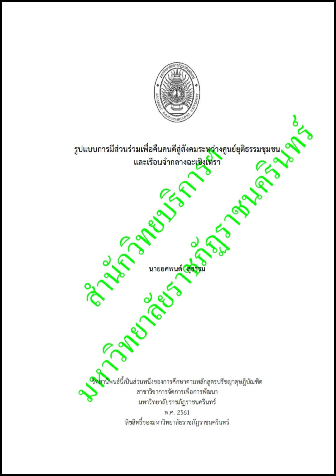 ชื่อเรื่อง/โครงการวิจัย | รูปแบบการมีส่วนร่วมเพื่อคืนคนดีสู่สังคมระหว่างศูนย์ยุติธรรมชุมชนและเรือนจำกลางฉะเชิงเทรา |