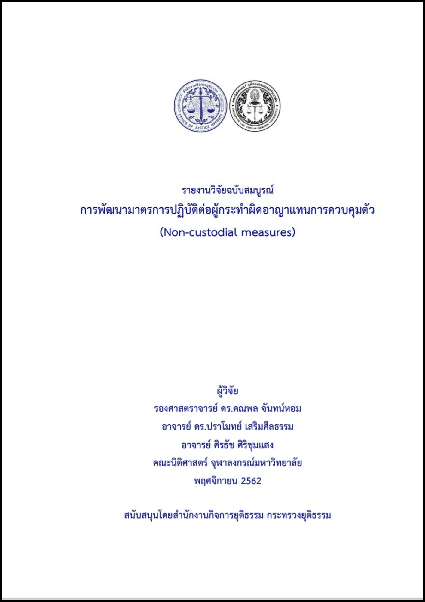 ชื่อเรื่อง/โครงการวิจัย | การพัฒนามาตรการปฏิบัติต่อผู้กระทำผิดอาญาแทนการควบคุมตัว (Non-custodial measures) |