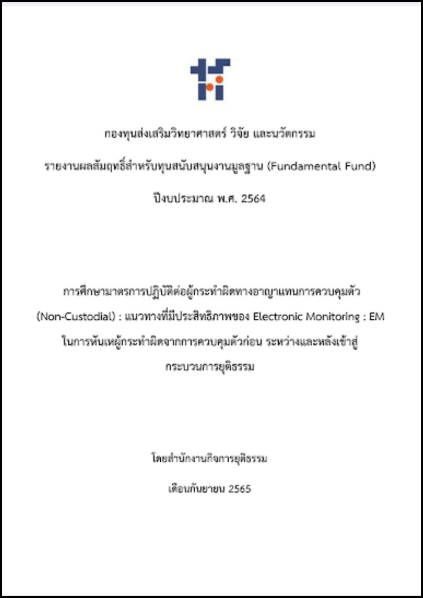 การศึกษาวิจัยโครงการ "การศึกษามาตรการปฏิบัติต่อผู้กระทำผิดทางอาญาแทนการควบคุมตัว (Non-custodial) : EM ในการหันเหผู้กระทำผิดจากการควบคุมตัวก่อน ระหว่าง และหลังเข้าสู่กระบวนการยุติธรรม"ซึ่งเป็นกิจกรรมภายใต้ชุดโครงการวิจัยเพื่อหันเหผู้กระทำผิดออกจากกระบวนการยุติธรรมได้ดำเนินการศึกษาแนวคิดเกี่ยวกับการนำเครื่องมืออิเล็กทรอนิกส์ติดตามตัวมาใช้เพื่อหันเหผู้กระทำความผิดออกจากการควบคุมตัวโดยได้ศึกษาแนวคิดในการปฏิบัติต่อผู้กระทำความผิดแทนการควบคุมตัวและการนำเครื่องมืออิเล็กทรอนิกส์ติดตามตัวผู้กระทำความผิดโดยได้พิจารณาศึกษาเปรียบเทียบกฎหมายและมาตรการที่เกี่ยวข้องกับการใช้เครื่องมืออิเล็กทรอนิกส์ติดตามตัวทั้งของไทยและต่างประเทศ นอกจากนี้ยังได้ทำการเก็บข้อมูลภาคสนามทั้งเชิงสถิติและเชิงปริมาณ ประกอบด้วยการทำแบบสอบถาม การสัมภาษณ์เชิงลึกและการสนทนากลุ่ม โดยมีแหล่งข้อมูลเป็นผู้แทนกลุ่มผู้เกี่ยวข้องกับการใช้เครื่องมืออิเล็กทรอนิกส์ติดตามตัว ๔ กลุ่ม คือ ผู้กระทำความผิดที่ใช้เครื่องมืออิเล็กทรอนิกส์ติดตามตัวเพื่อ หันเหออกจากการควบคุมตัวผู้บริหารของหน่วยงานในกระบวนการยุติธรรมทางอาญาผู้ปฏิบัติงานของหน่วยงานในกระบวนการยุติธรรมทางอาญาและผู้ทรงคุณวุฒิในทางกฎหมายอาญาและกระบวนการยุติธรรมทางอาญาสำนักงานกิจการยุติธรรมเล็งเห็นถึงความสำคัญในการพัฒนาระบบและวิธีการในการปฏิบัติต่อผู้กระทำความผิดโดยการพัฒนาระบบจำกัดบริเวณผู้กระทำความผิดด้วยระบบอิเล็กทรอนิกส์มาปรับใช้แทนการควบคุมตัวผู้กระทำความผิดเพื่อการแก้ปัญหาความแออัดในเรือนจำ ทั้งยังเป็นการตอบโจทย์แนวคิดการฟื้นฟูตัวผู้กระทำความผิดจึงเป็นการสมควรที่จะศึกษาแนวคิดที่มา และวิธีการควบคุมผู้กระทำความผิด โดยเครื่องมืออิเล็กทรอนิกส์วิเคราะห์ลักษณะ ของกลุ่มเป้าหมายกฎหมายที่เกี่ยวข้องกับมาตรการการนำเครื่องมืออิเล็กทรอนิกส์มาใช้เพื่อหันเหผู้กระทำความผิดออกจากกระบวนการยุติธรรมของต่างประเทศ และบทบาทขององค์กรที่ต้องรับผิดตามกลุ่มเป้าหมายที่กล่าวมา เพื่อจะได้ยกระดับการดำเนินการของหน่วยงานที่เป็นผู้รับผิดชอบหลัก เปิดโอกาสให้ผู้กระทำผิดกลับคืนสู่สังคมโดยไม่กลับมา กระทำผิดซ้ำอีกทั้งยังสร้างความเชื่อมั่นต่อประชาชนในการบังคับใช้กฎหมายและดำเนินกระบวนการยุติธรรมได้อย่างมีประสิทธิภาพ