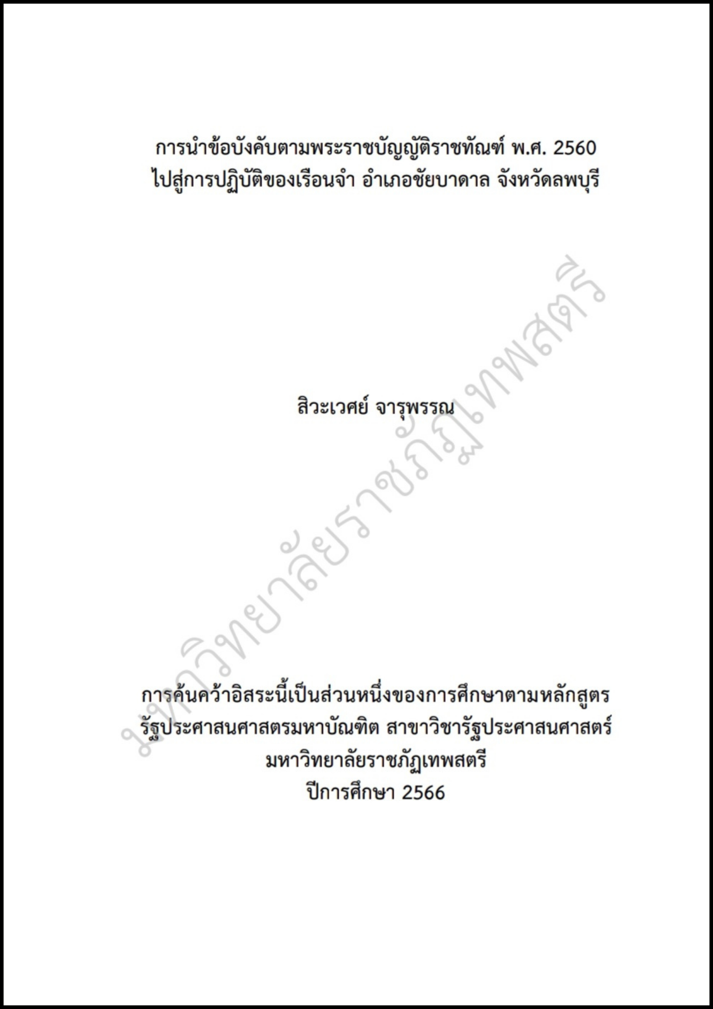 พบว่าการนำข้อบังคับตามพระราชบัญญัติราชทัณฑ์พ.ศ.2560ไปสู่การปฏิบัติของเรือนจำอำเภอชัยบาดาลจังหวัดลพบุรี ภาพรวมอยู่ในระดับมาก (µ = 4.00) เมื่อพิจารณาเป็นรายด้าน โดยเรียงค่าเฉลี่ยจากมากไปหาน้อยตามลำดับ ได้แก่1.ด้านการนำ ยุทธศาสตร์และแผนงาน (µ = 4.20) เน้นการทำงานเป็นทีมในการดูแลผู้ต้องขังภายในเรือนจำ 2.ด้านการควบคุม และตรวจสอบเน้นการนำหลักกฎหมายใช้ควบคุมผู้ต้องขังที่ใช้เครื่องพันธนาการ 3.ด้านการปฏิบัติงานของบุคลากร (µ = 4.02) เน้นกรมราชทัณฑ์มีอำนาจหน้าที่ปฏิบัติต่อผู้กระทำผิดให้เป็นไปตามคำพิพากษาของศาล 4.ด้านการบริหาร (µ = 3.86) เน้นผู้บริหารเข้าใจในกระบวนการการใช้เครื่องพันธนาการ 5.ด้านการนำไปใช้ในการปฏิบัติงาน(µ=3.79)เน้นการเลือกใช้ขนาดหรือชนิดของเครื่องพันธนาการในการควบคุมผู้ต้องขังได้อย่างยุติธรรม