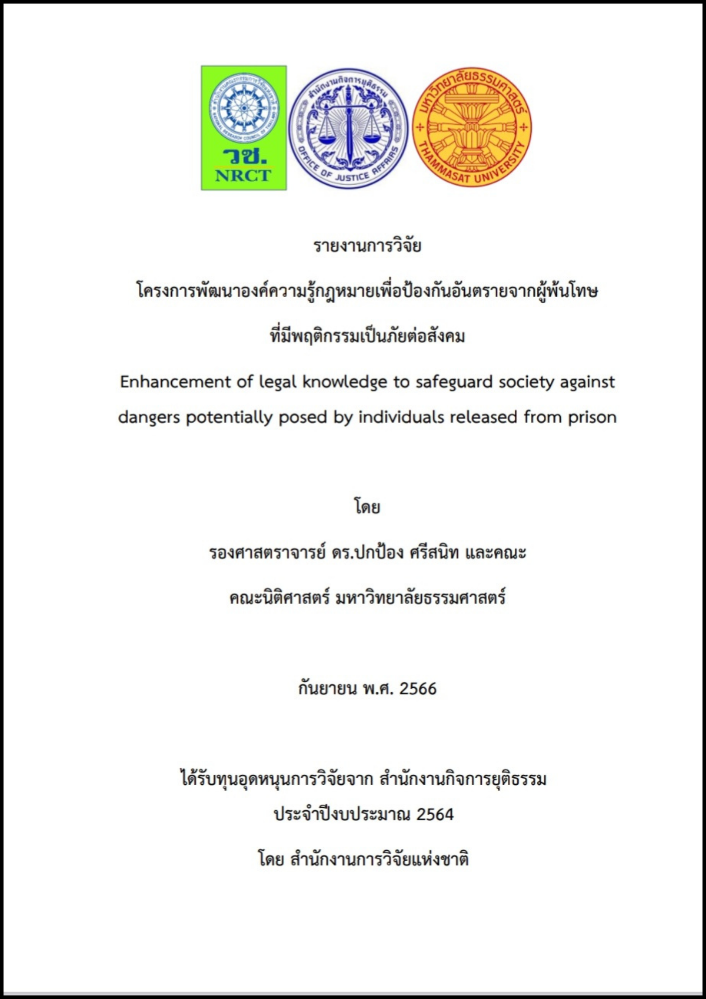 ชื่อเรื่อง/โครงการวิจัย | โครงการพัฒนาองค์ความรู้กฎหมายเพื่อป้องกันอันตรายจากผู้พ้นโทษที่มีพฤติกรรมเป็นภัยต่อสังคม |