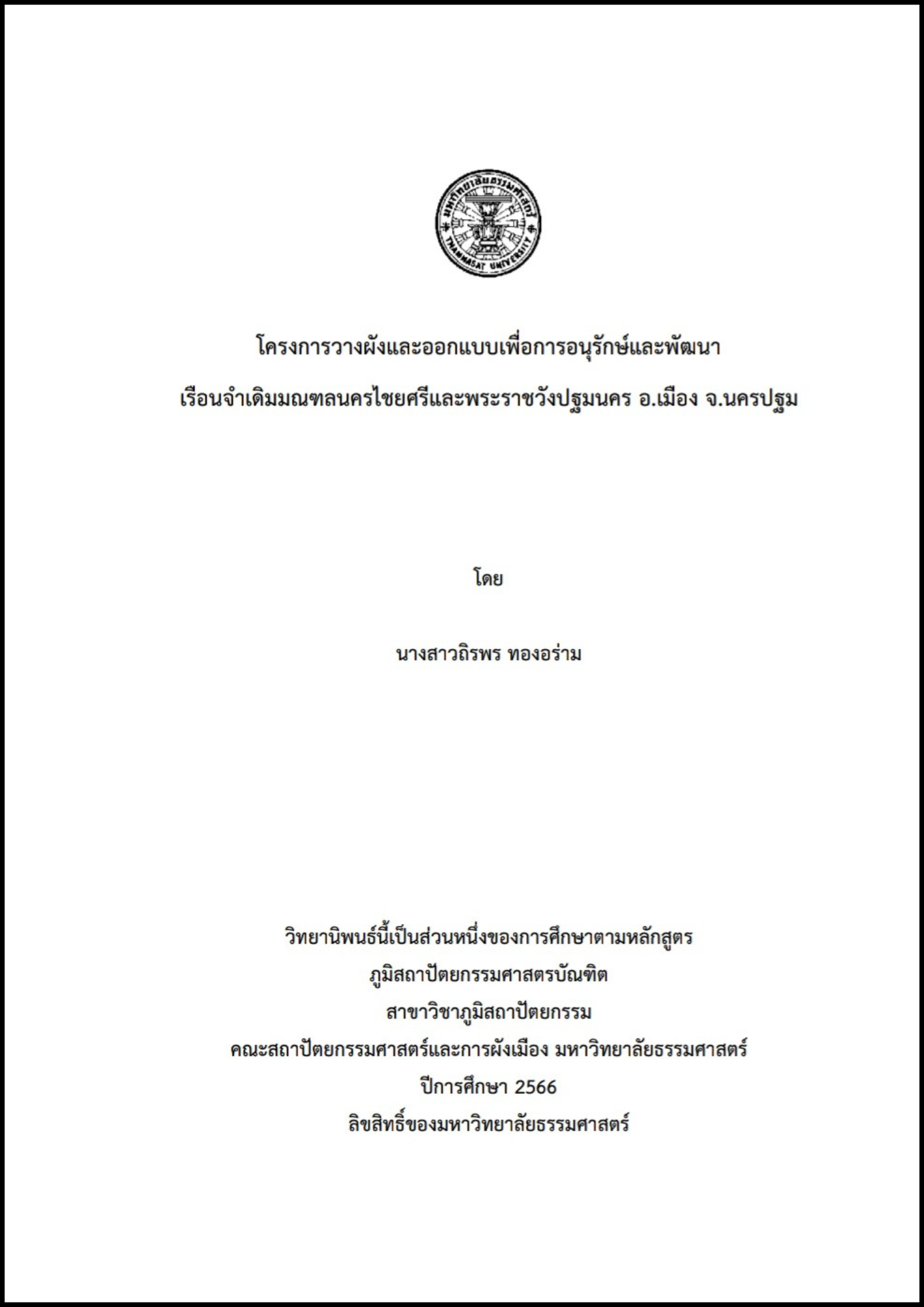 โครงการวางผังและออกแบบเพื่อการอนุรักษ์และพัฒนาเรือนจำเดิมมณฑลนครไชยศรีและพระราชวังปฐมนคร อ.เมือง จ.นครปฐม มีที่มาจากโครงการสวนสาธารณะแปลงเรือนจำกลางนครปฐม(เดิม) ของเทศบาลนครนครปฐม ผนวกกับมติที่เห็นว่าควรอนุรักษ์พื้นที่พระราชวังปฐมนครพื้นที่โครงการ อยู่ในตำแหน่งที่ถือว่าเป็นศูนย์กลางเมืองและย่านประวัติศาสตร์ ของนครปฐม อยู่ทางด้านทิศตะวันออกของพระปฐมเจดีย์ และขนาบข้างไปกับแกนเมือง ที่ถูกสร้างขึ้นจากการพัฒนาเส้นทางคมนาคมในสมัยรัชกาลที่ 4 ด้วยร่องรอยประวัติศาสตร์ของพื้นที่ที่มีความเชื่อมโยงกัน วิทยานิพนธ์ฉบับนี้จึงได้นำเสนอการวางผังและออก แบบพื้นที่ประวัติศาสตร์ โดยมีจุดมุ่งหมายในการอนุรักษ์คุณค่าโบราณสถานและภูมิทัศน์วัฒนธรรมของพื้นที่ให้คงคุณค่าสืบไปพร้อมทั้งคำนึงถึงการพัฒนาพื้นที่ให้สอดคล้องกับวิถีชีวิตและประโยชน์ที่จะสร้างให้กับผู้ใช้งานในปัจจุ บันและสืบต่อไปยังอนาคต เพื่ออนุรักษ์และพัฒนาให้เป็นพื้นที่แหล่งเรียนรู้ประวัติศาสตร์นันทนาการ พักผ่อนหย่อนใจ รวมไปถึงการรองรับกิจกรรมของเมือง นอกเหนือจากนั้น ก็ยังมีการคำนึงถึงบริบทโดยรอบซึ่งนำไปสู่แนวทางในการพัฒนาให้เกิดจินตภาพของการเป็นย่านประวัติศาสตร์เชื่อมโยงมุมมองและเส้นทางการเรียนรู้ประวัติศาสตร์และภูมิทัศน์วัฒนธรรมของเมืองนครปฐม